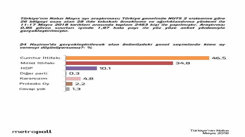 Metropoll Araştırma’nın 11-17 Mayıs tarihlerinde yaptığı ankete göre, Türkiye’de 24 Haziran’da yapılacak seçimlerde Cumhur İttifakı yüzde 46.5, Millet İttifakı yüzde 34.8 oy alacak. HDP ise yüzde 10.1’le baraj sınırında.