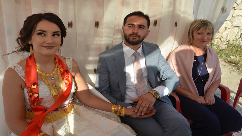 Bölgenin gelenek ve göreneklerine göre yapılan düğünde, Fransız gelinin akrabaları da yöresel Kürt kıyafetlerini giyerek, halay çekti.