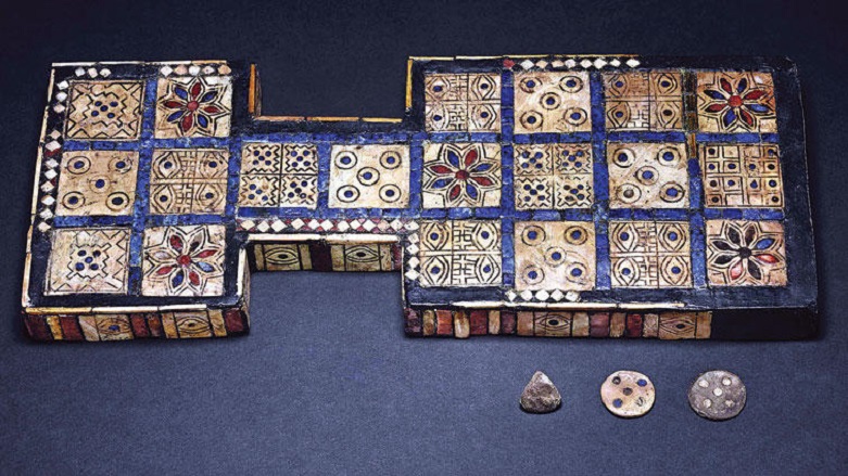 Yine British Museum’da sergilenen Ur kraliyet mezarlığında bulunan 20 kare bölüme ayrılmış deniz kabuğu kakmalı ahşap oyun masası, yuvarlak oyun taşları ve zarları (M.Ö. 2500 - 2400) bilinenler arasında bir ilk olarak gösteriliyor.