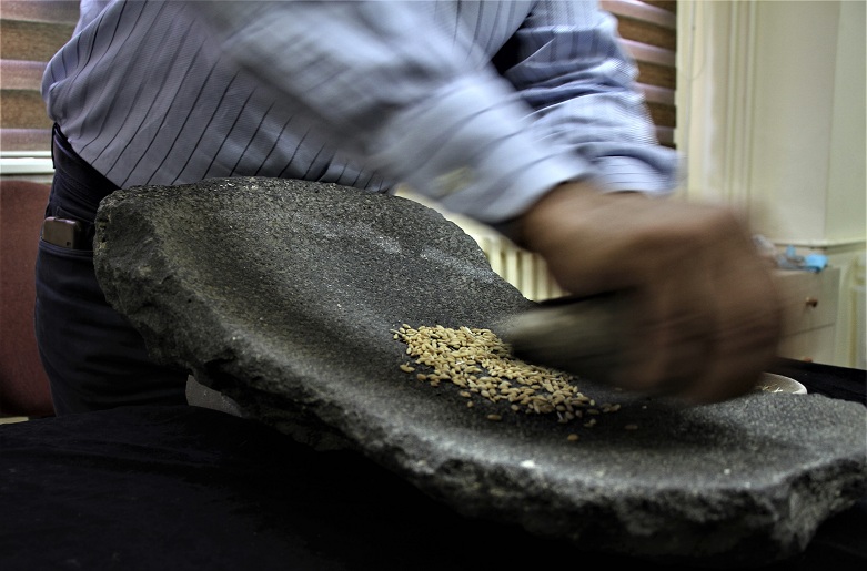 "İki parçadan oluşuyor. Üst taş sürtünmede, alt taş da gözenekli olarak kullanılıyor. İki taşın sürtünmesiyle içindeki buğday ufalanıp, un haline geliyor. Birinci bin yılda bu çok yaygın olarak kullanılmış. İnsanoğlu, alıştığı, kültür haline getirdiği bazalt taşın bu öğütme özelliğini bildiğinden dolayı teknolojisi sadece gelişiyor.