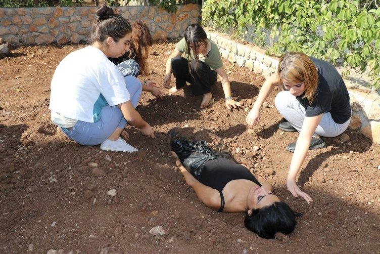 Mordem Sanat Merkezi’nde bir araya gelen sanatçılar, ilginç bir atölye çalışmasına imza attı. Doğum ve ölüm temalı çalışmada sanatçılar, önce arkadaşlarını toprağa gömerek ardından da kendilerini diri diri toprağa gömerek ne hissettiklerini ortaya çıkarmaya çalıştı.