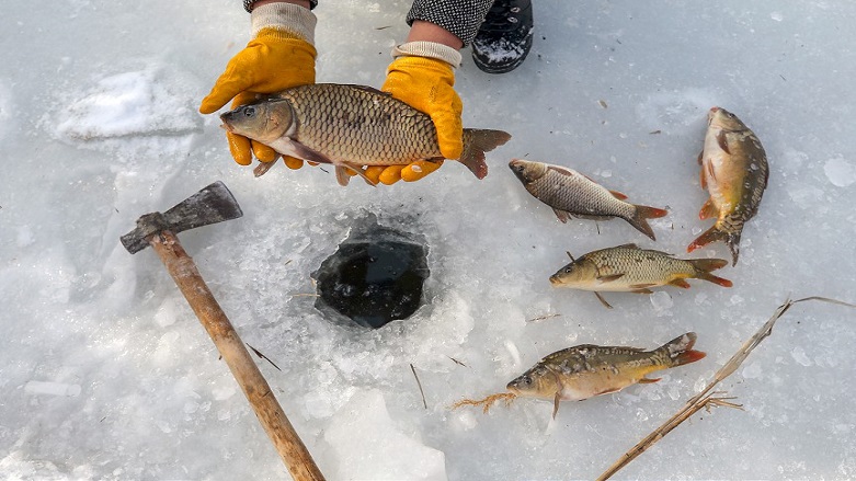 Her gün burada buzu farklı bir noktadan baltayla kırıp ağlarını suya bırakan balıkçılar, tehlikeli bir av gerçekleştiriyor.