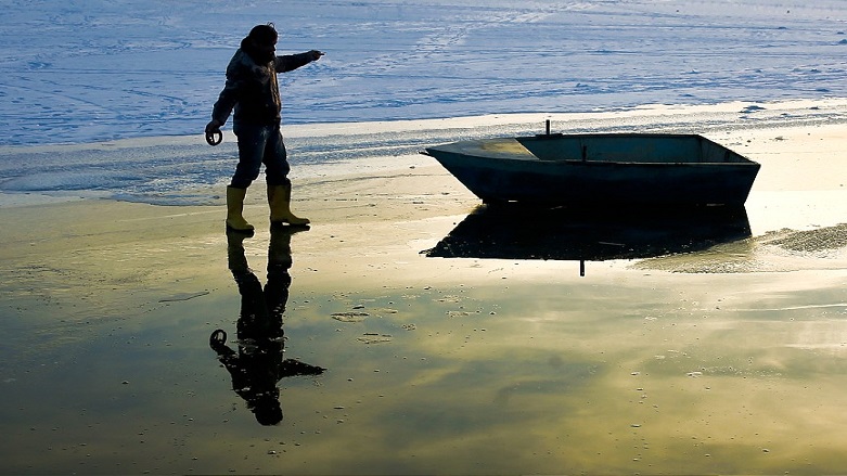 Van'ın Edremit ilçesinde bazı vatandaşlar, yüzeyi kısmen donan Van Gölü'nün sazlık alanında tehlikeye aldırış etmeden ağlarla balık avlıyor.