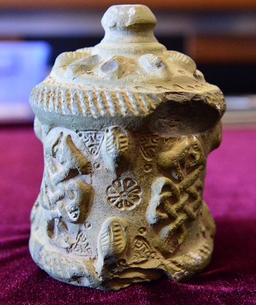 Kabın pişmiş topraktan yapıldığını ifade eden Önal, kabın ağzındaki küçük deliğin de sıvının dökülmemesi için bir tıpayla kapatıldığının tahmin edildiğini söyledi.